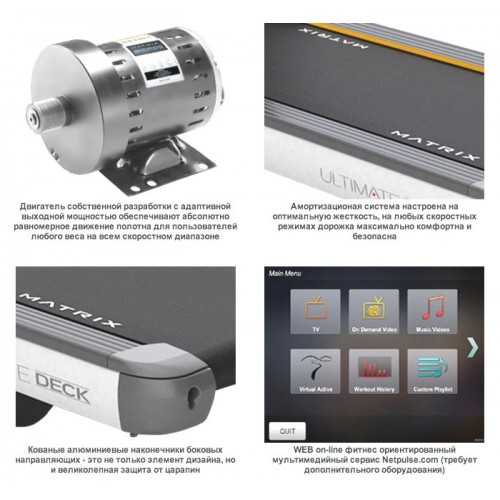 ПРОГРАММНЫЕ РЕШЕНИЯ. Matrix традиционно находится в числе лидеров по внедрению новых софтверных решений. Они касаются самых разнообразных сторон эксплуатации тренажера - от различных специализированных тренировочных профилей (тренировки по стандартам армии США, "Gerkin-протокол" Пожарной Службы США, PEB-тест Службы Федеральных маршалов США и другие), выгрузки результатов тренировок в on-line сервис Livestrong, развлекательной составляющей с использованием iPod/iPhone/Nike+iPod, фитнес ориентированного мультимедийного on-line сервиса Netpulse и революционной технологии интерактивного видео "Виртуальный ландшафт™" (Virtual Active™) до беспроводной системы глобального сбора эксплуатационных данных Asset Management™ и интеграции с внешними системами анализа состояния пользователя (CSAFE, FitLinxx™ Wireless RF, Fitconnection).